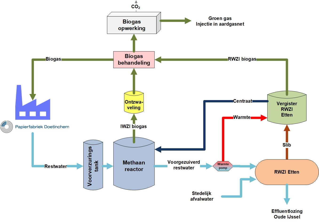 Waterstromen treats residual water from Papierfabriek Doetinchem at the Etten location. By pumping the residual water from the paper factory separately to location Etten with a pressure pipeline, the residual water can be treated anaerobically, producing biogas. The biogas, together with biogas produced in the sludge digestion of RWZI Etten, is delivered to Papierfabriek Doetinchem through a biogas pipeline. In addition, part of the biogas is upgraded to green gas through biogas reprocessing and injected into the natural gas grid.