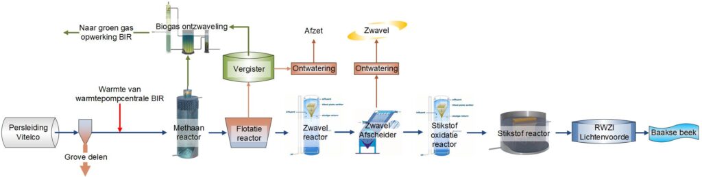 The water treatment plant treats wastewater from the Vitelco Leather tannery. This plant is managed and owned by Waterstromen. The water is transported from the tannery in the center of Lichtenvoorde to the water treatment plant (next to location RWZI Lichtenvoorde) with a pressure pipeline of approx. 2 km. Among other things, the water contains high concentrations of COD, nitrogen, sulfide, sulfate, chromium, salt and lime.