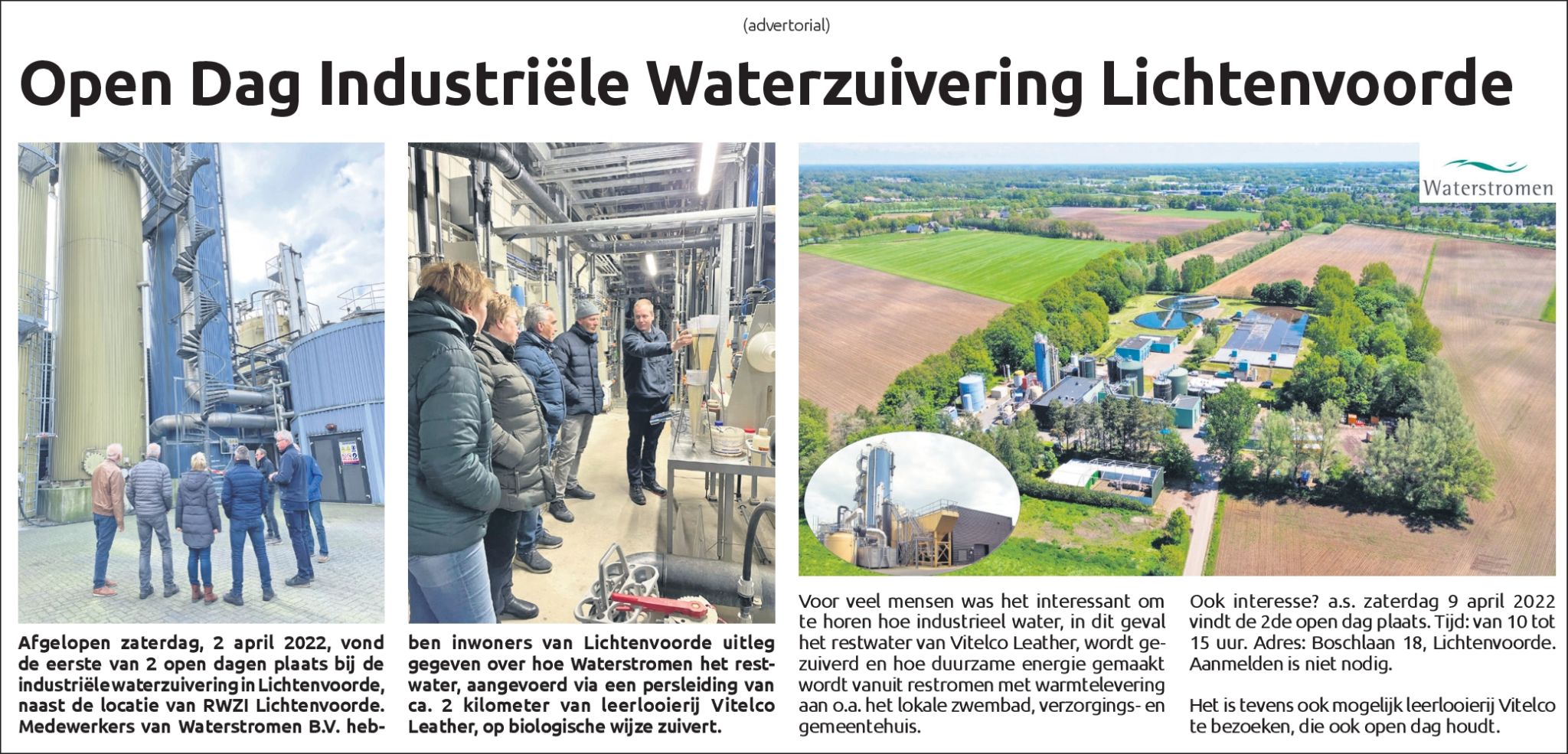 Op zaterdag 2 en 9 april 2022 vonden de open dagen plaats bij de industriële waterzuivering in Lichtenvoorde, op de locatie van het RWZI Lichtenvoorde. Medewerkers van Waterstromen B.V. hebben inwoners van Lichtenvoorde uitleg gegeven over hoe Waterstromen het restwater, aangevoerd via een persleiding van ca. 2 kilometer van leerlooierij Vitelco Leather, op biologische wijze zuivert.